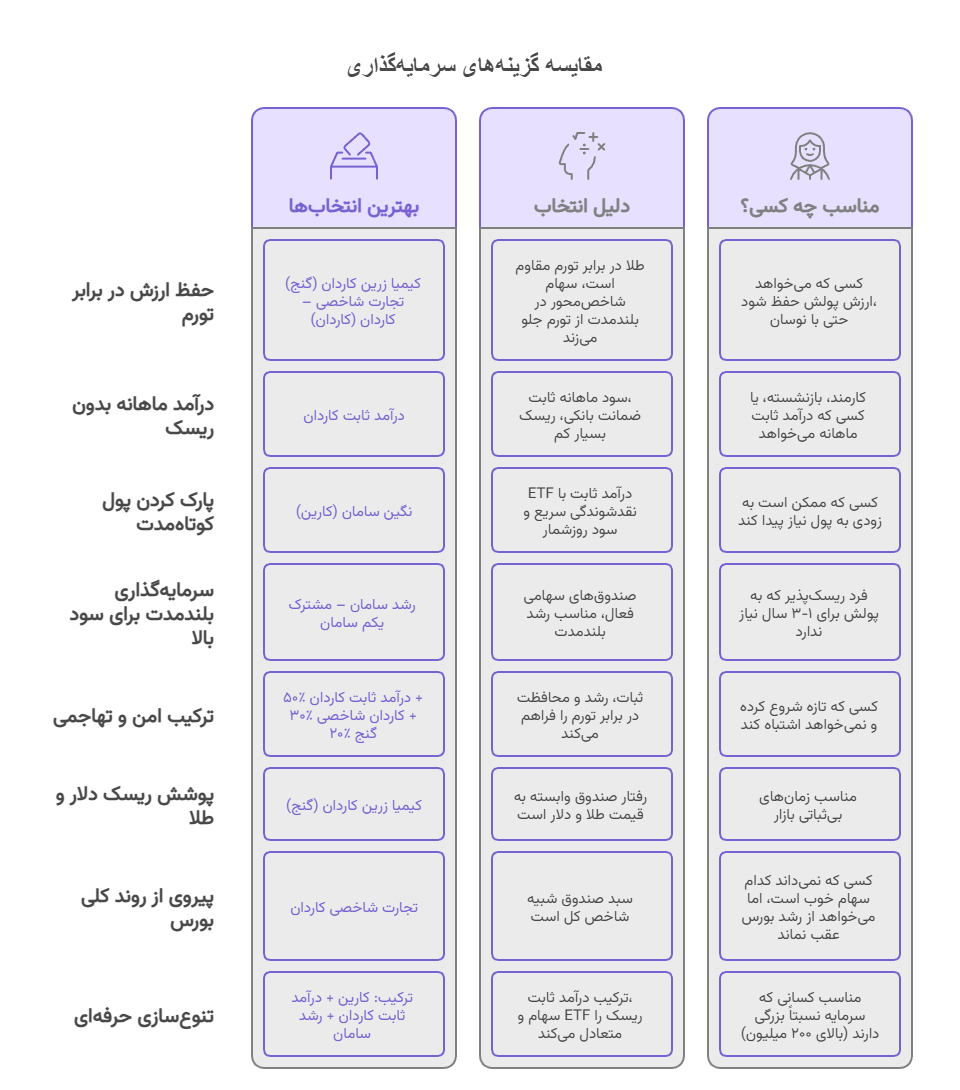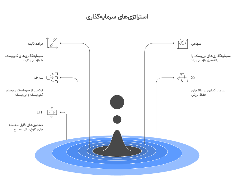 • برای شروع و یادگیری: یک ترکیب ساده مثل ۷۰٪ درآمد ثابت + ۳۰٪ طلا یا شاخصی